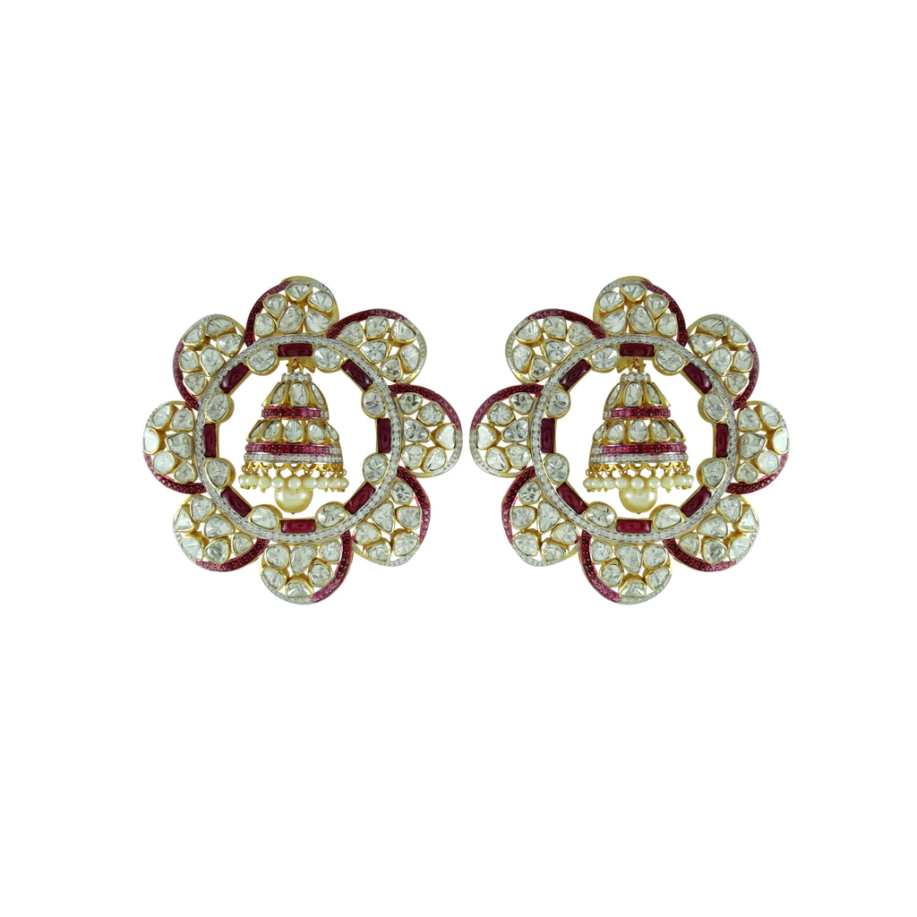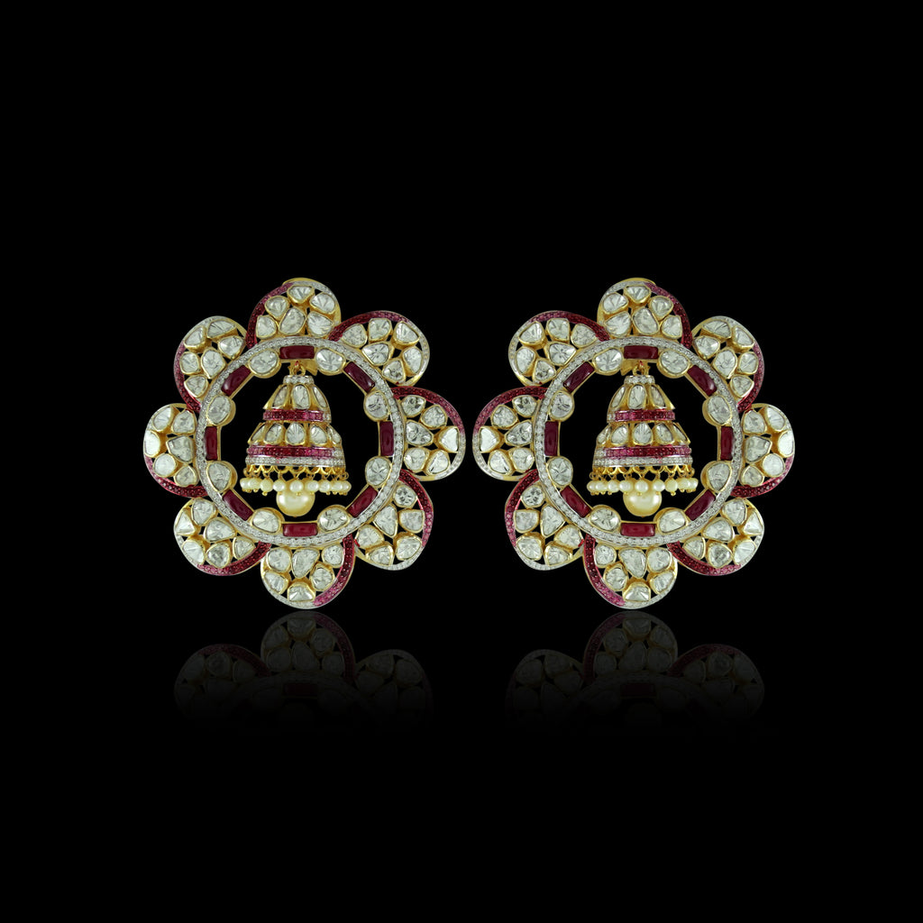 Handcrafted in 14K gold, these circular polki studs feature a floral halo silhouette with ruby accents encircling a delicate jhumka drop, blending symmetry, traditional detailing, and graceful movement within a bold yet balanced design.