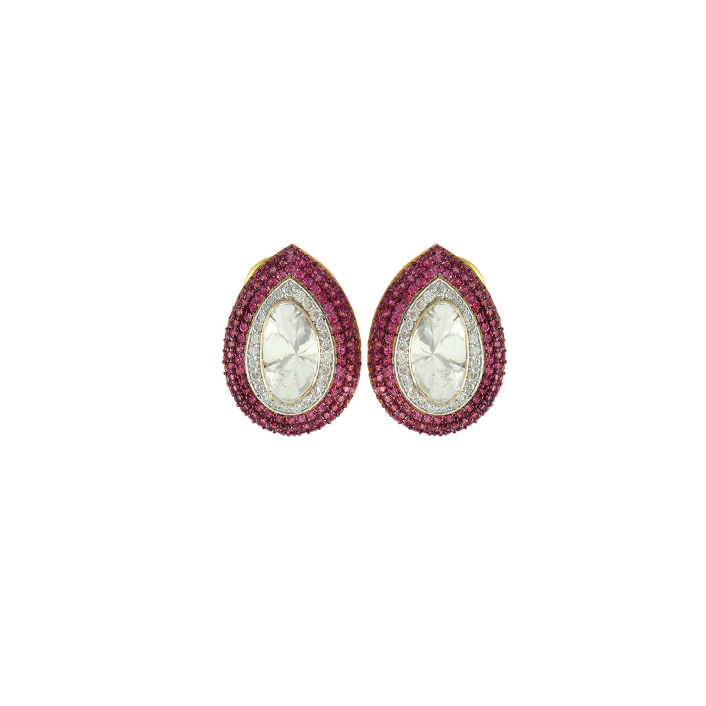 Crafted in 14k gold, these ambi-shaped studs feature a luminous polki centre framed by rich ruby accents. Silhouette feels timeless yet refined, offering a graceful balance of colour, form, and understated elegance for everyday luxury.