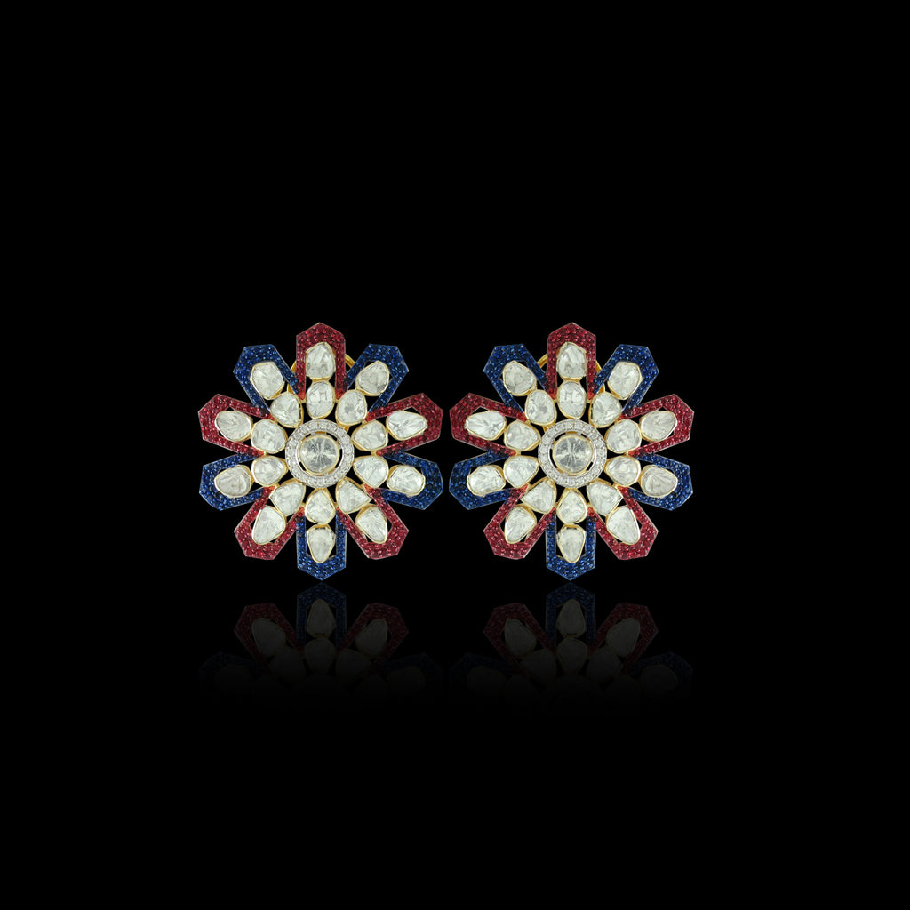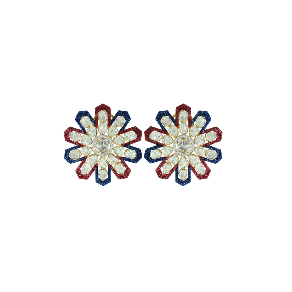 Set in 14k gold, these studs showcase a precise radial silhouette of Polki diamonds, framed by alternating ruby and sapphire accents. The structured sunburst form creates depth, symmetry, and a bold yet refined statement.