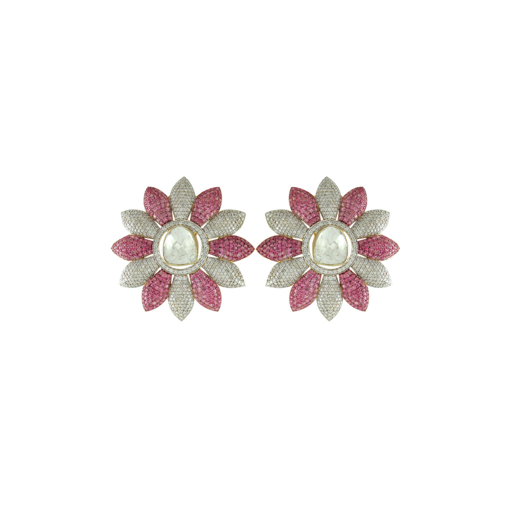 Crafted in 14k gold, these floral stud earrings showcase a luminous polki centre, encircled by alternating pink sapphire and diamond petals, forming a sculptural bloom with gentle contrast, refined symmetry, and delicate surface detailing.