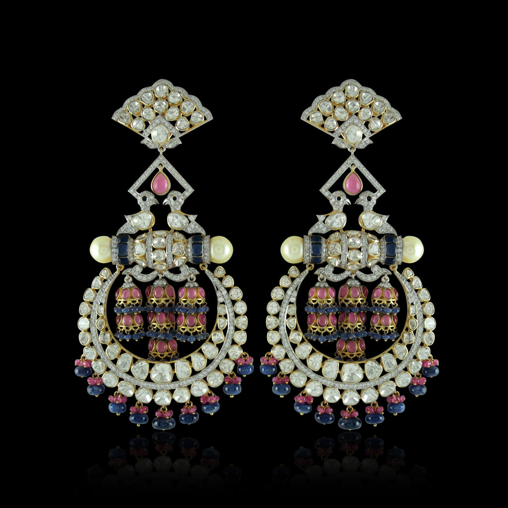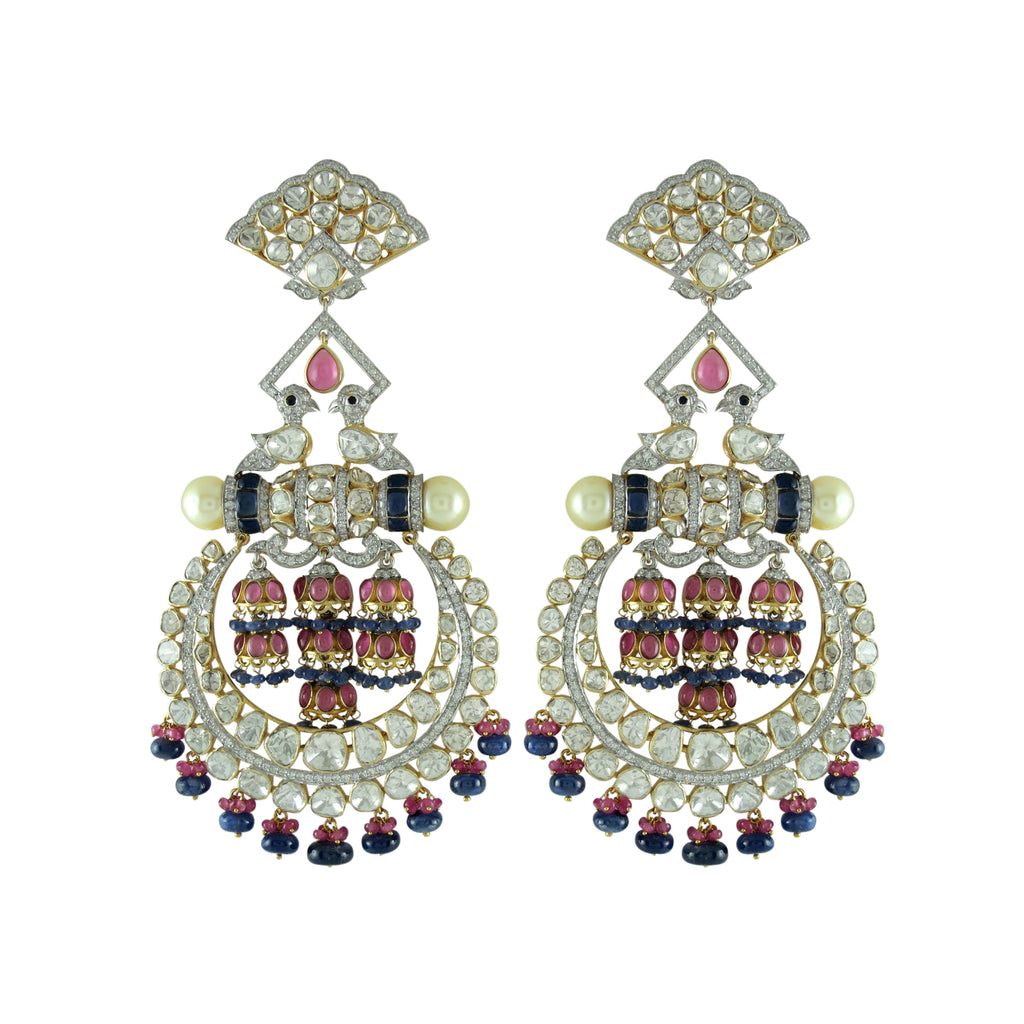 Crafted in 14k gold, these ornate chandbalis feature layered polki crescents, internal jhumka clusters, pink and blue sapphire accents, pearl fringes, and intricate articulation, creating a dramatic heirloom silhouette with rich movement and depth.