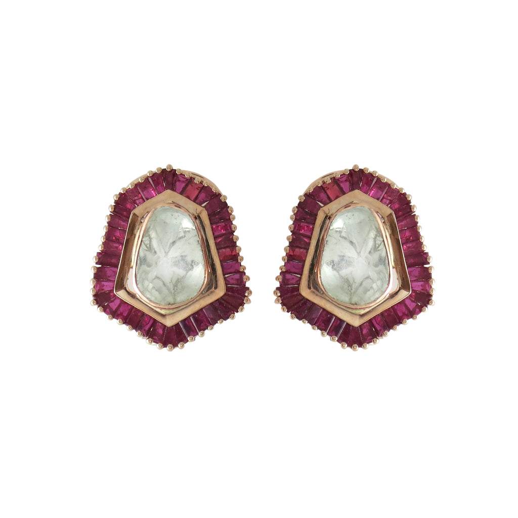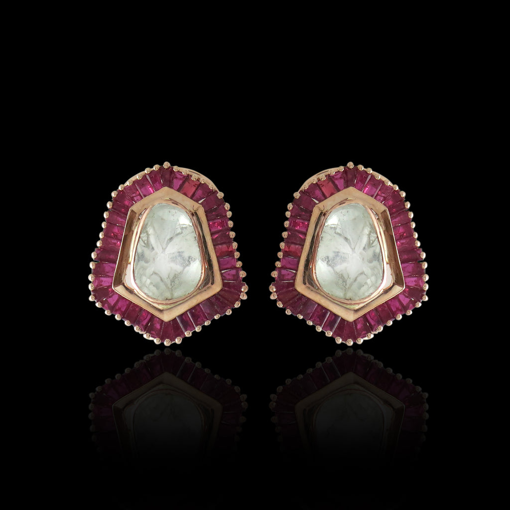 Centered with a luminous uncut polki diamond, these 14K gold studs are encircled by vivid ruby baguettes in a sculpted geometric halo. The structured silhouette and intricate beaded detailing create a bold, luxurious statement.