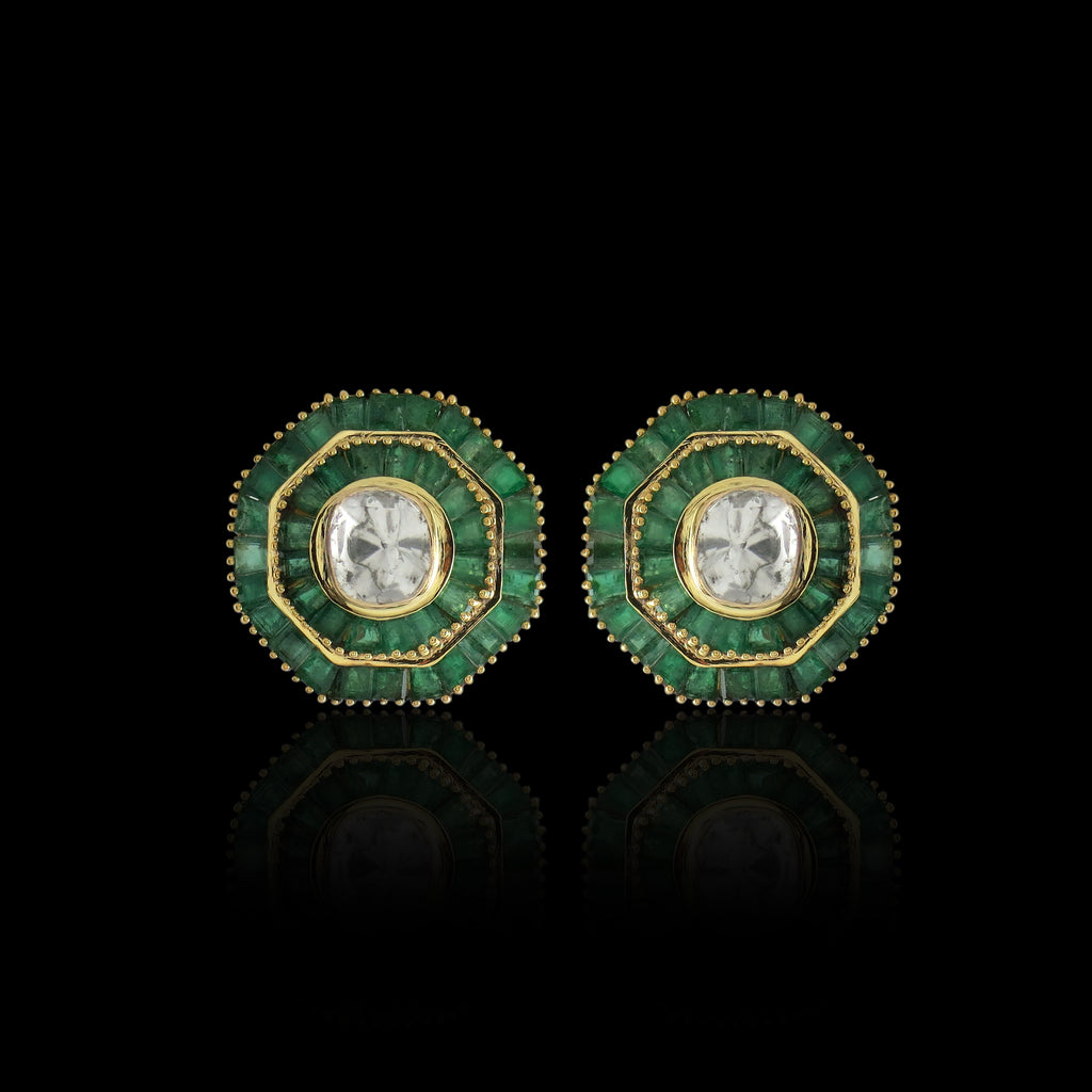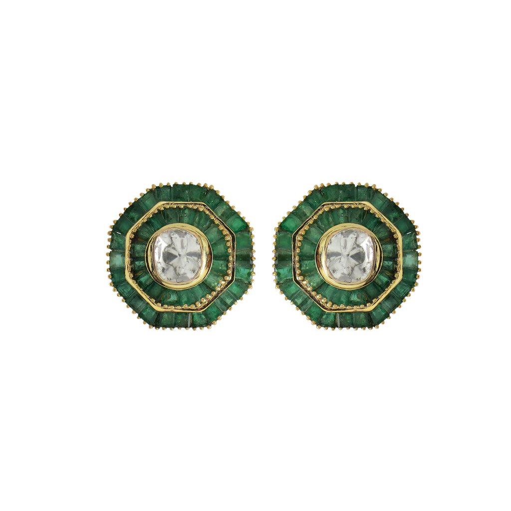 Crafted in 14K gold, these striking studs showcase a luminous uncut polki diamond at the center, encircled by a regal crown of rich emerald baguettes. Intricate gold detailing enhances the bold geometric silhouette with refined grandeur.