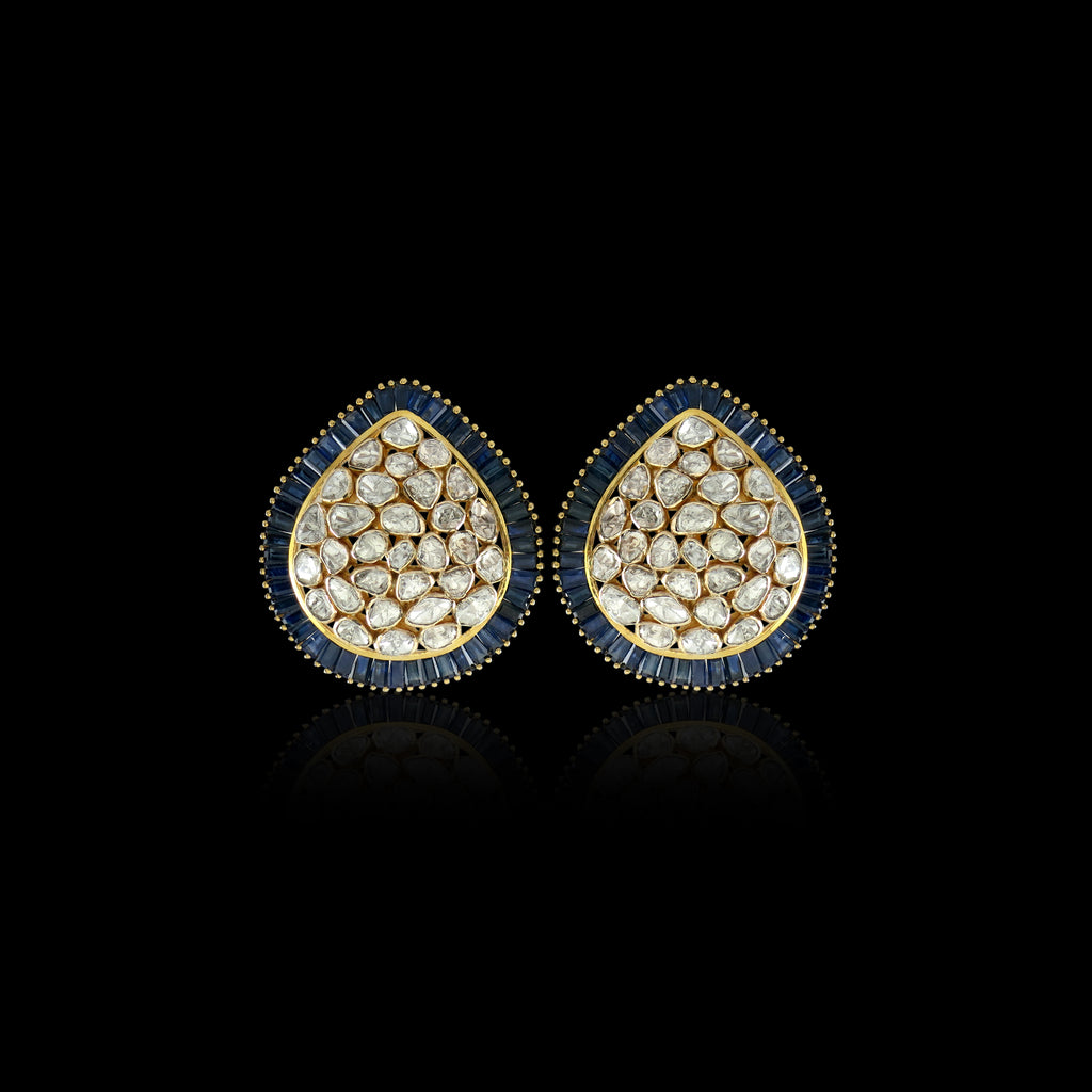 These Sapphire Teardrop Polki Studs showcase a refined teardrop form adorned with glowing Polki diamonds and framed by rich blue sapphires, all set in 14k gold for a timeless, graceful finish..