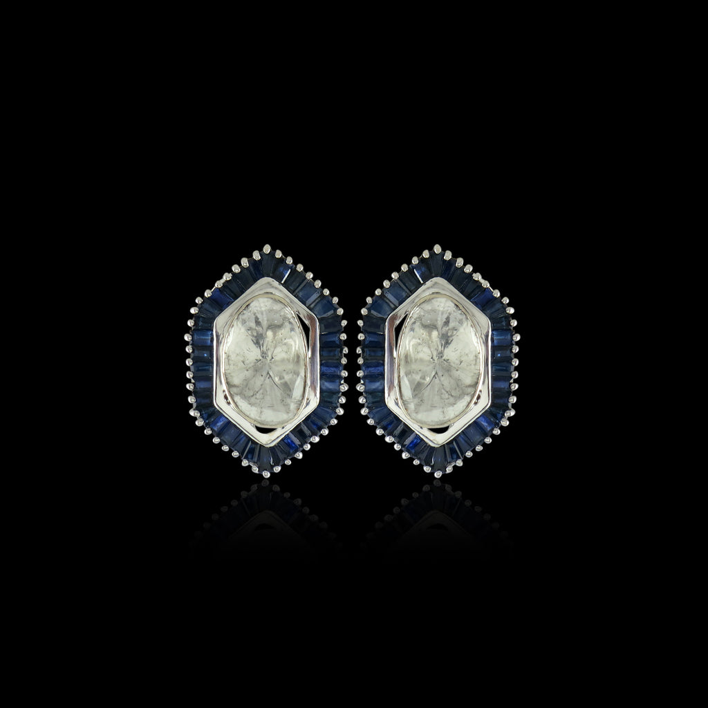 A bold shield-shaped design featuring luminous polki diamonds at the center, encircled by a refined halo of deep blue baguette sapphires. Striking yet elegant, these studs add a polished statement to any look.