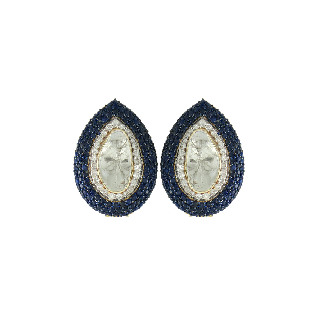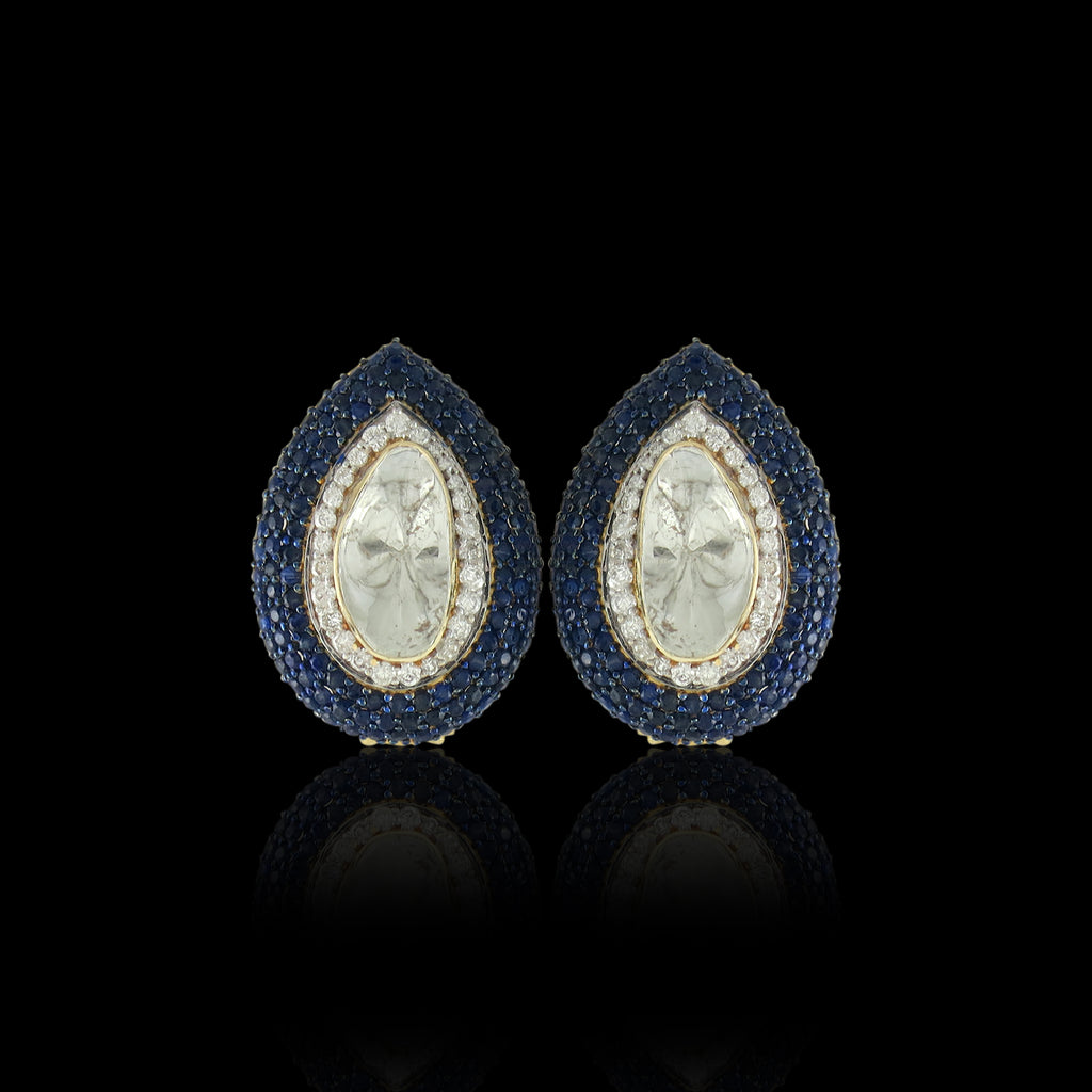 A graceful teardrop polki diamond rests at the center, delicately framed by a soft diamond halo and encircled with deep blue sapphires in 14k gold. Refined in form and rich in detail, these studs offer a perfect balance of heritage craftsmanship and modern elegance.